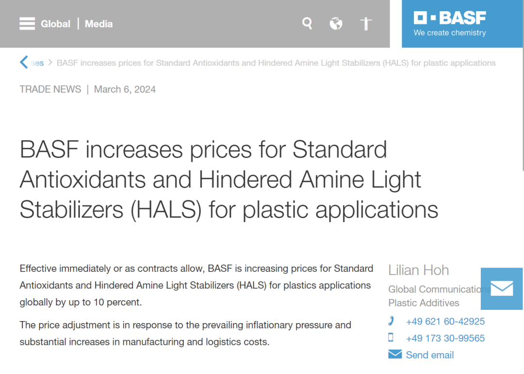 为应对通货膨胀及制造和物流成本上升,巴斯夫决定提高将塑料用标准抗氧化剂和受阻胺光稳定剂的价格上调10%,即日起或根据合同规定生效。